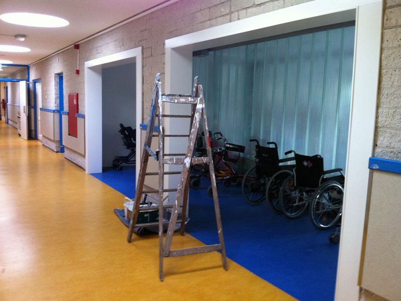 Natuurlijk zijn er nog een paar maanden nodig om te wennen en goed in te richten. In ieder geval is het gebouw nu beter geïsoleerd en is er opslagruimte (zie foto) voor tilliften, rolstoelen et cetera. Er zijn groepen en doorgangen vergroot en verplaatst.