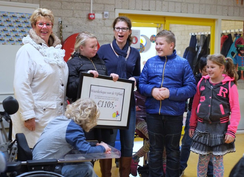 Afgelopen woensdag 18 november ontving orthopedagogisch dagcentrum De Vijfhoek een prachtige donatie naar aanleiding van de laatste wens van opa Jaap Groot. Na een kort ziekbed heeft hij aangegeven geen bloemen te willen, maar donaties voor JET (stichting Jeugd en Techniek Castricum) en De Vijfhoek. Omdat zijn kleinzoon Sven Bos op De Vijfhoek heeft gezeten heeft Jaap veel klusjes als vrijwilliger op De Vijfhoek gedaan. De donatie van € 1.105,- werd door zijn vrouw Bea en de kleinkinderen Amber, Job en Bas overhandigd aan Jacqueline Peijenburg van De Vijfhoek. Het idee is om van het geld een fijne schommelbank aan te kunnen schaffen. Van de familie waren ook Diana en Edwin Bos, Peter en Susan Groot en Miranda en Lobke Glorie bij de bijzondere overdracht aanwezig.