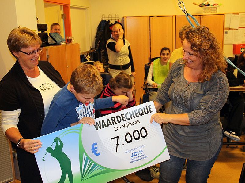 Een nieuwe (geur)tuin is een stap dichterbij gekomen voor De Vijfhoek, het orthopedagogisch dagcentrum voor kinderen met een verstandelijke en/of meervoudige beperking in Heiloo. Junior Kamer Heerhugowaard overhandigde dinsdag 9 oktober een cheque ter waarde van € 7.000,- aan de Stichting Vrienden van de Vijfhoek. Deze stichting ondersteunt De Vijfhoek met de realisatie van diverse projecten.