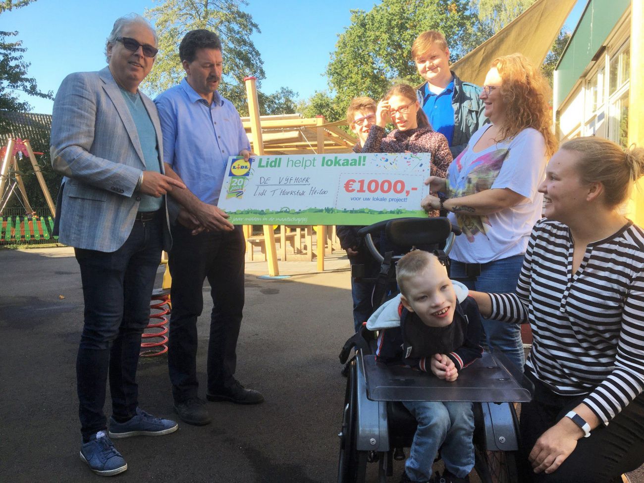 Op zaterdag 23 september ontving groepsleidster Judith van ODC De Vijfhoek een cheque t.w.v. € 1.000,- van supermarkt Lidl uit winkelcentrum ’t Hoekstuk in Heiloo. De filiaalmanagers Peter en Peter organiseerden in het kader van het 20-jarig jubileum de actie Lidl helpt lokaal waarbij klanten werden uitgenodigd om suggesties in te leveren voor een goed doel. Natascha die op De Vijfhoek werkt droeg het idee aan om een Ipad Pro met extra groot touchscreenscherm en grote toetsen aan te kunnen schaffen voor de kids met een beperking. Zij werkt onder andere op de ‘leren leren klas’. Deze kinderen worden een aantal uren per week ondersteund door een leerkracht met kans om door te stromen naar het onderwijs. Vanuit 23 voorgestelde instellingen en organisaties werd door Lidl gekozen voor De Vijfhoek. Een goed doel dat veel mensen blij maakt! Lidl wil met deze maatschappelijke actie haar trouwe klanten bedanken omdat ze al jaren voor hun boodschappen voor Lidl kiezen. Helaas kon Natascha door omstandigheden niet aanwezig zijn bij het feestelijk in ontvangst nemen van de cheque.